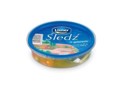 Kawałki parowanych filetów z łososia 26% w galarecie. Główne składniki produktu: woda, łosoś, warzywa w zmiennych proporcjach (marchew, kukurydza, groszek), żelatyna wieprzowa, sól, przyprawy, ekstrakty warzyw.